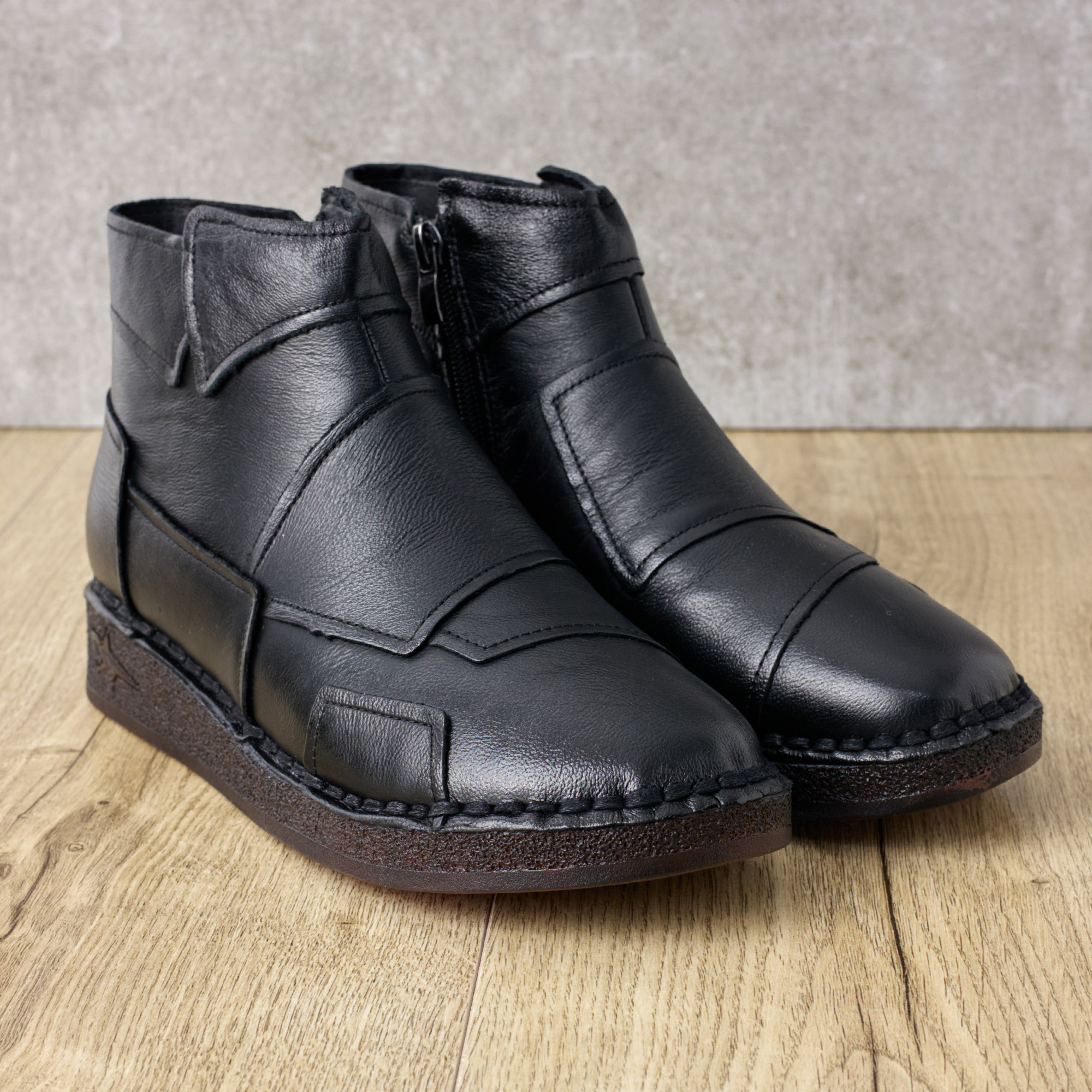 Ghete Tellus cu plenitudine crescută, corespund completitudine 9 pe grila dimensională. Fabricate din piele italiană neagră autentică. Un branț anatomic moale care oferă confort la mers, împreună cu o talpă din poliuretan ușoară și flexibilă, fac ghetele Tellus ideale pentru fiecare zi. Modelul are fermoar pentru o îmbrăcare ușoară. Dimensiuni branț 36-23cm, 37-23.5cm, 38-24cm, 39-25.5cm, 40-26cm, 41-26.5cm. Inaltime toc 3 cm Completitudinea pantof 9